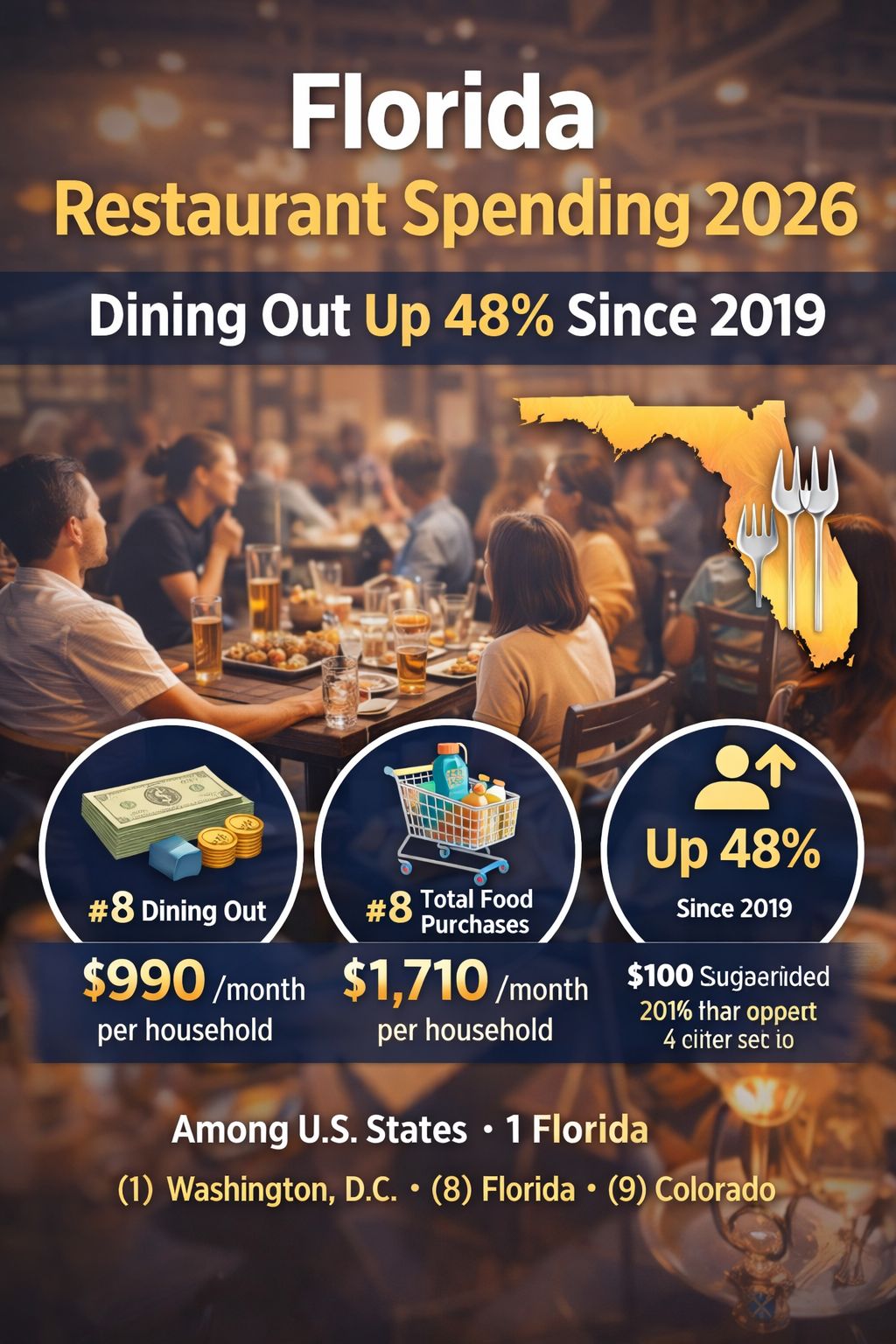 Florida currently trails only Washington, D.C., Hawaii, Nevada, California, Massachusetts, New York and Texas in dining-out spending.