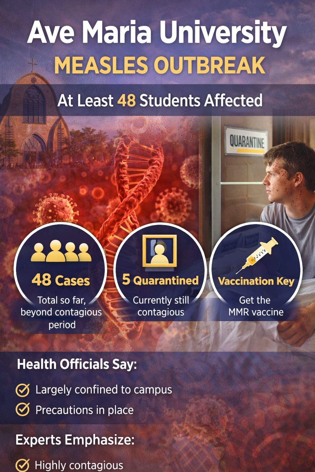 Since the start of the semester, at least 48 students at Ave Maria University have contracted measles, and five students are currently quarantined, according to university and public health updates.