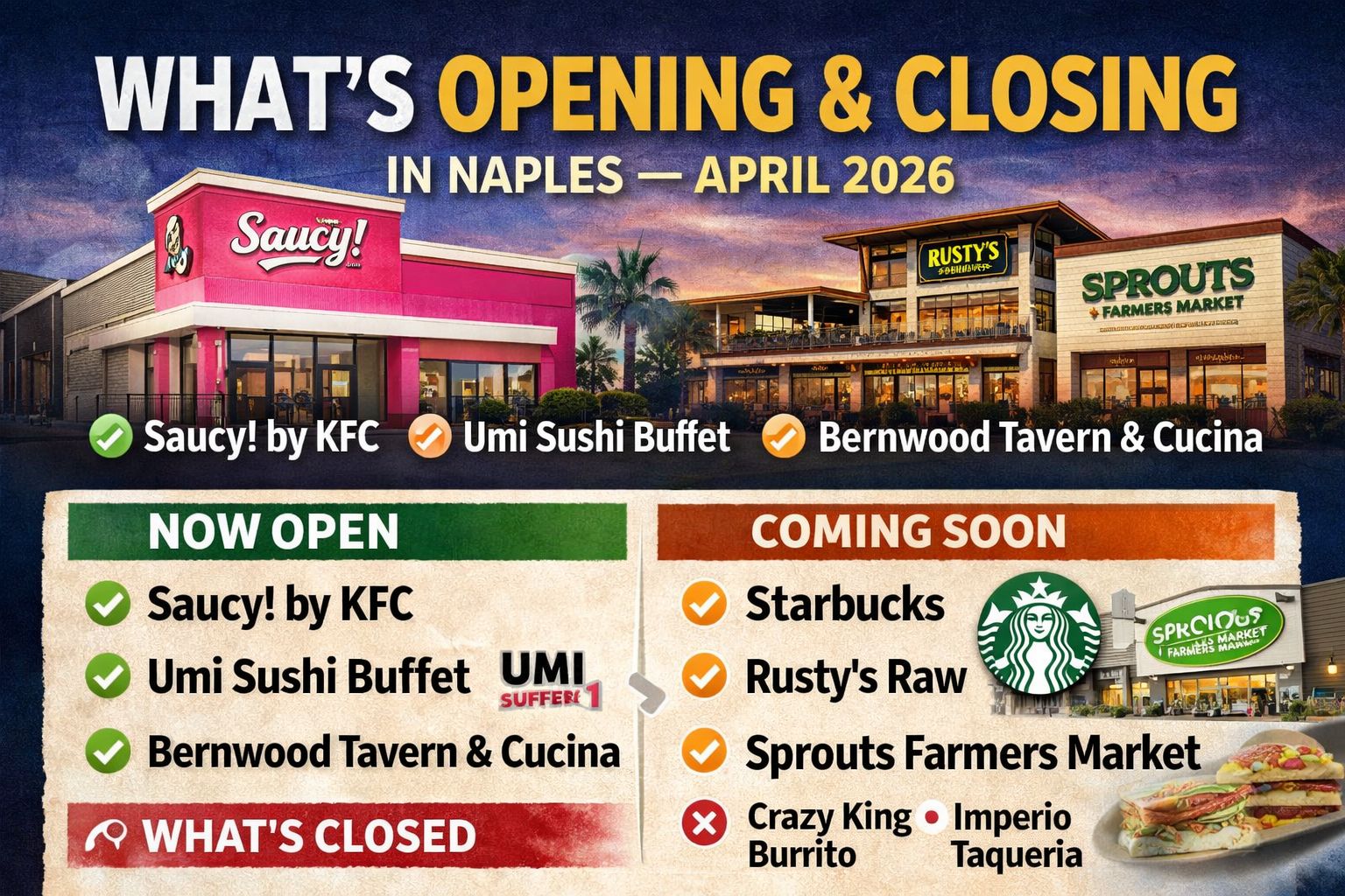 Here is your complete guide to what's new, what's coming, and what's gone in the Naples area this month.
